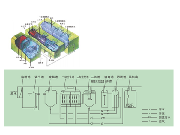 2、二級生物接觸氧化處理工藝均采用推流式生物接觸氧化,其處理效果優(yōu)于完全混合式或二級串聯(lián)完全混合式生物接觸氧化池,并比活性污泥池體積小, 對水質(zhì)的適應(yīng)性強,耐沖擊負荷性能好,出水水質(zhì)穩(wěn)定,不會產(chǎn)生污泥膨脹。池中采用新型彈性立體填料,比表面積大,微生物易掛膜,脫膜,在同樣有機物負 荷條件下,對有機物去除率高,能提高空氣中的氧在水中溶解度。
